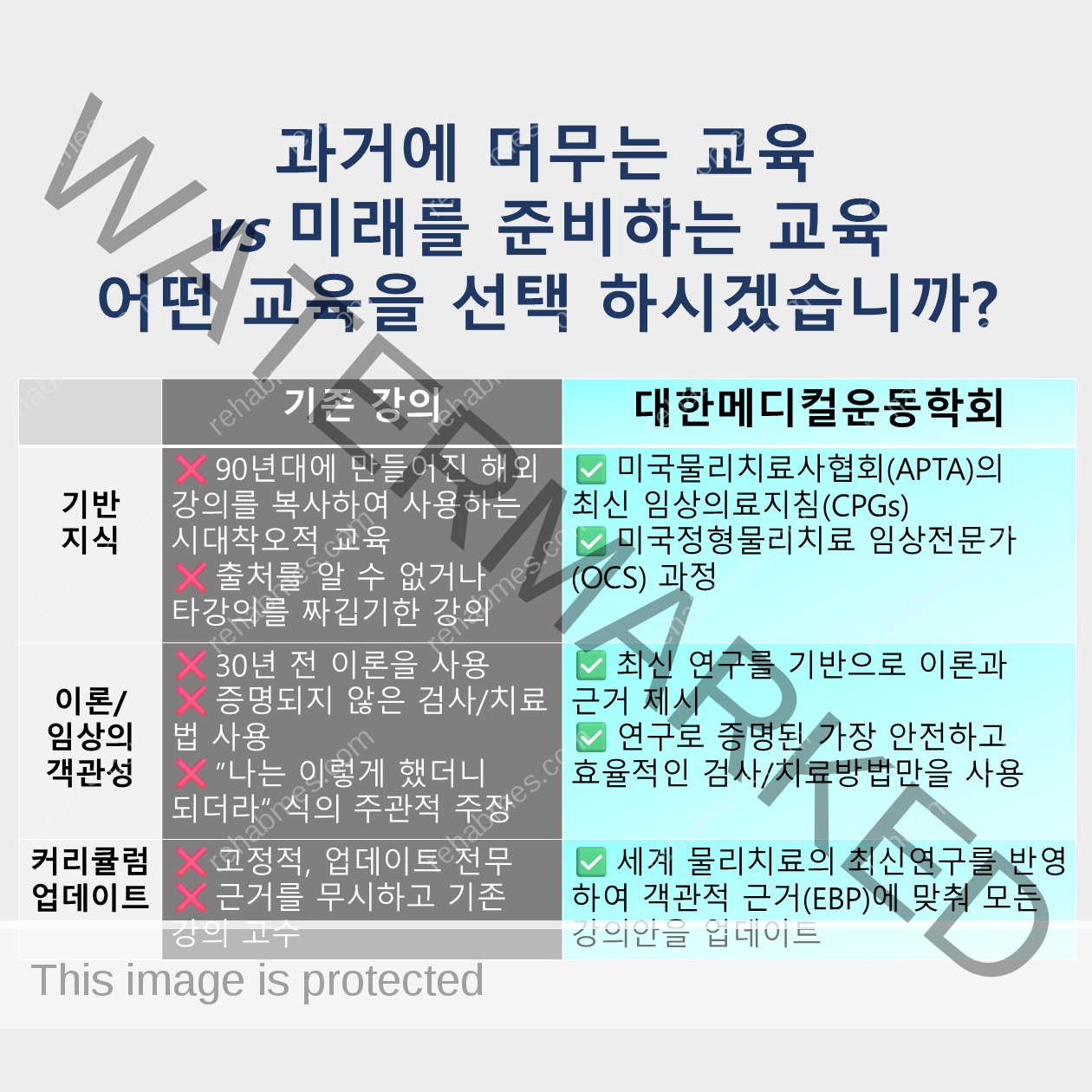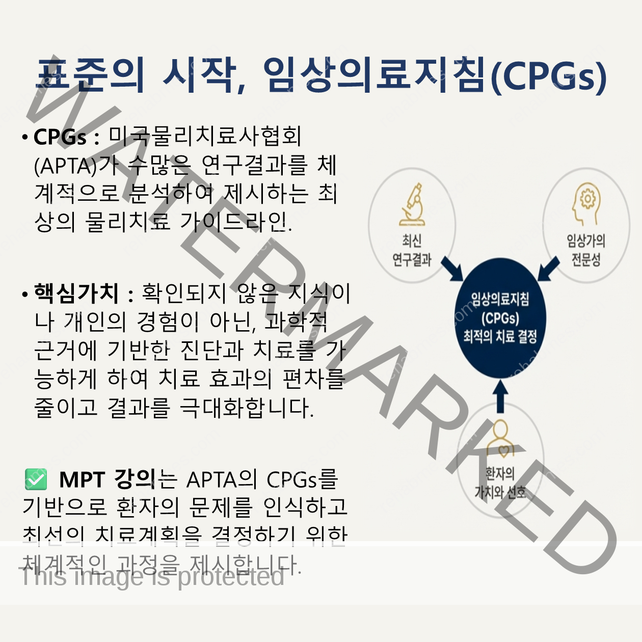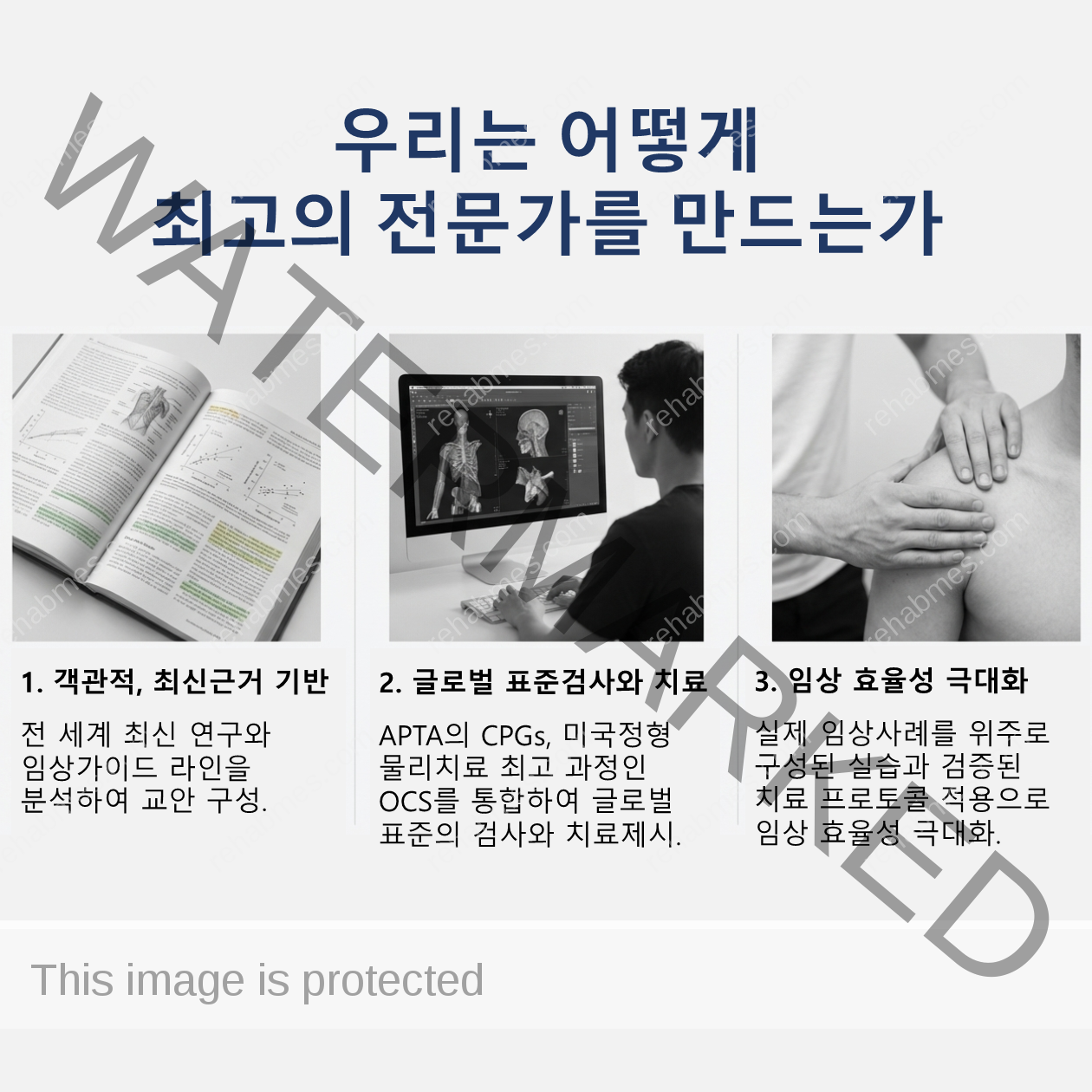 본 교육과정은 미국물리치료사협회(APTA)의 임상의료지침(Clinical Practice Guidelines, CPGs)과 미국정형물리치료 임상전문가 과정(Orthopedic Clinical Specialist, OCS)을 기반으로 철저하게 근거중심으로 구성되어 있습니다