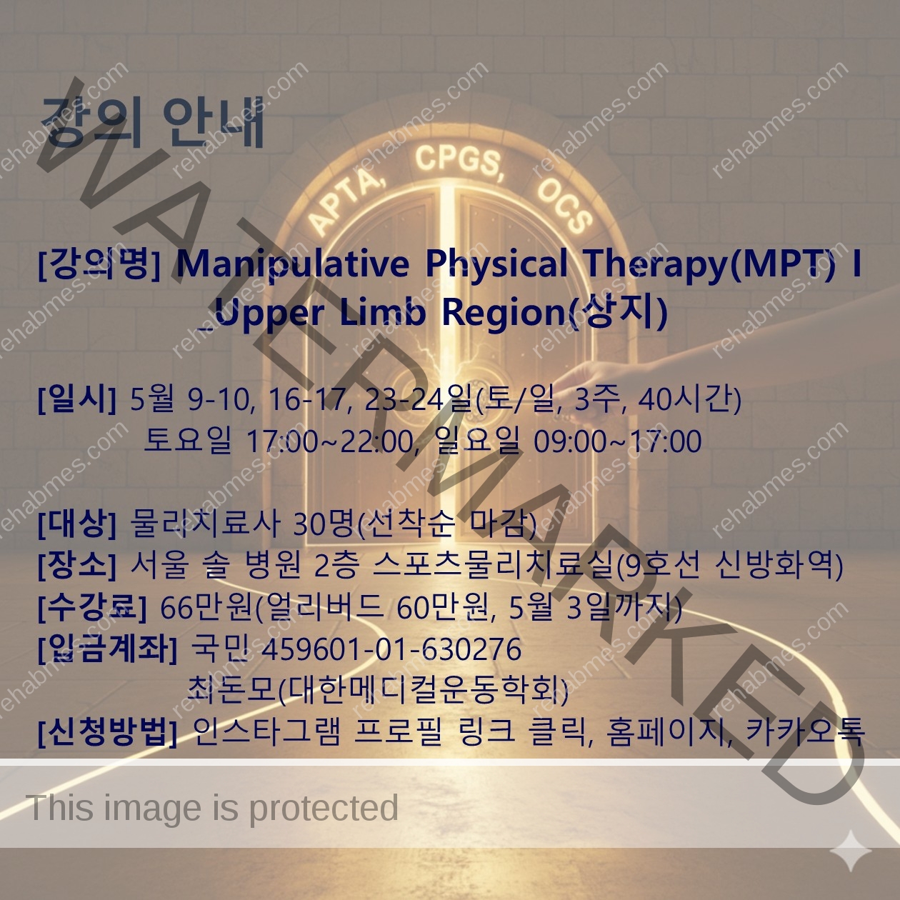 [대한메디컬운동학회] 국내 유일의 미국물리치료사협회 임상의료지침(CPGs), 미국정형물리치료(OCS) 기반 강의_Manipulative Physical Therapy(MPT) Course I_Upper Limb Region 5월 9일 서울 개최(토/일 3주 과정)