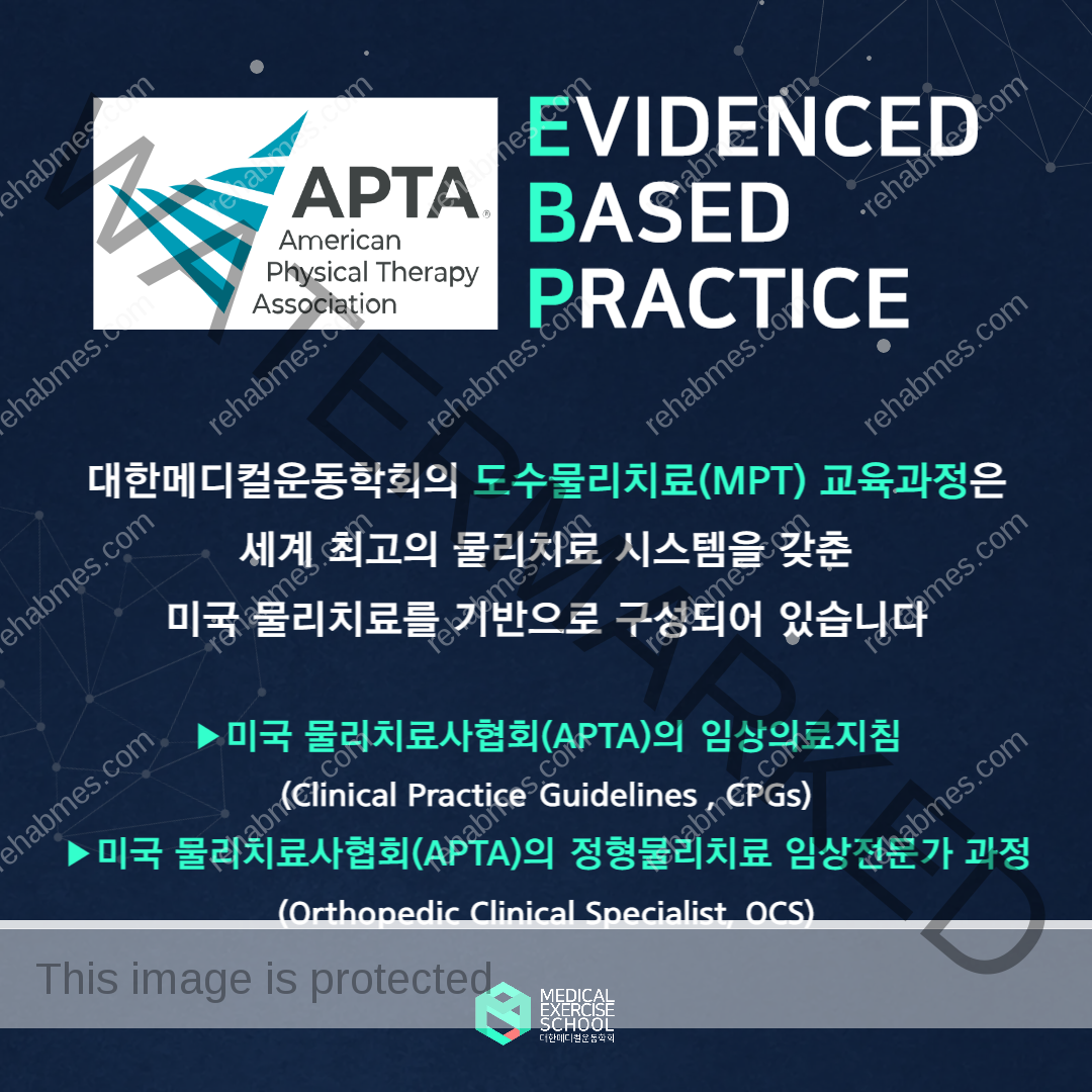 모든 교육내용은 미국물리치료사협회(APTA)의 임상의료지침(Clinical Practice Guidelines, CPGs)과 미국물리치료사협회(APTA)의 정형물리치료 임상전문가 과정(Orthopedic Clinical Specialist, OCS)로